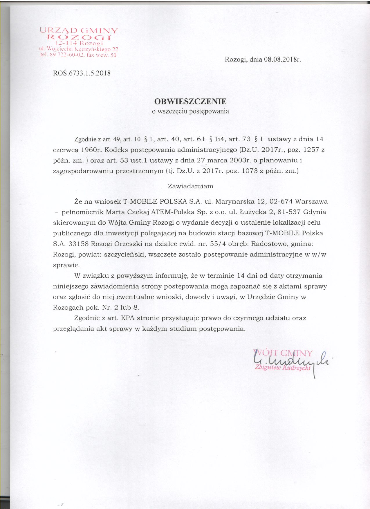 Obwieszczenie o wszczęciu postępowania w sprawie wydania decyzji o lokalizacji inwestycji celu publicznego dla przedsięwzięcia polegającego na budowie stacji bazowej T-MOBILE Polska S.A. 33158 Rozogi Orzeszki na działce ewid. nr. 55/4 obręb: Radostowo, gmina: Rozogi, powiat: szczycieński,